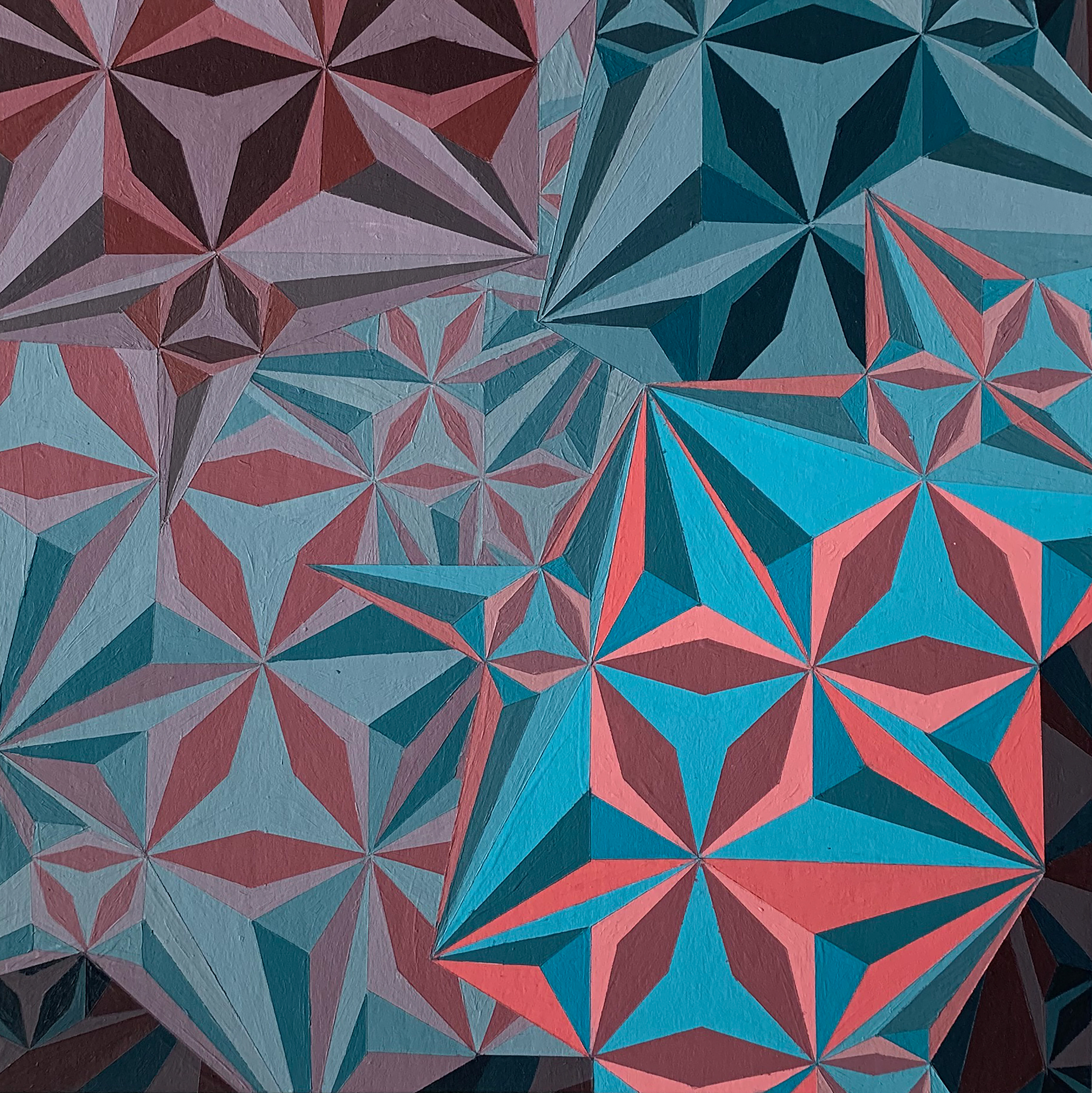 An isometric graph with a complimentary color scenario with variations of hue, tint, and shade. Acrylic paint on a 10x10 inch illustration board.