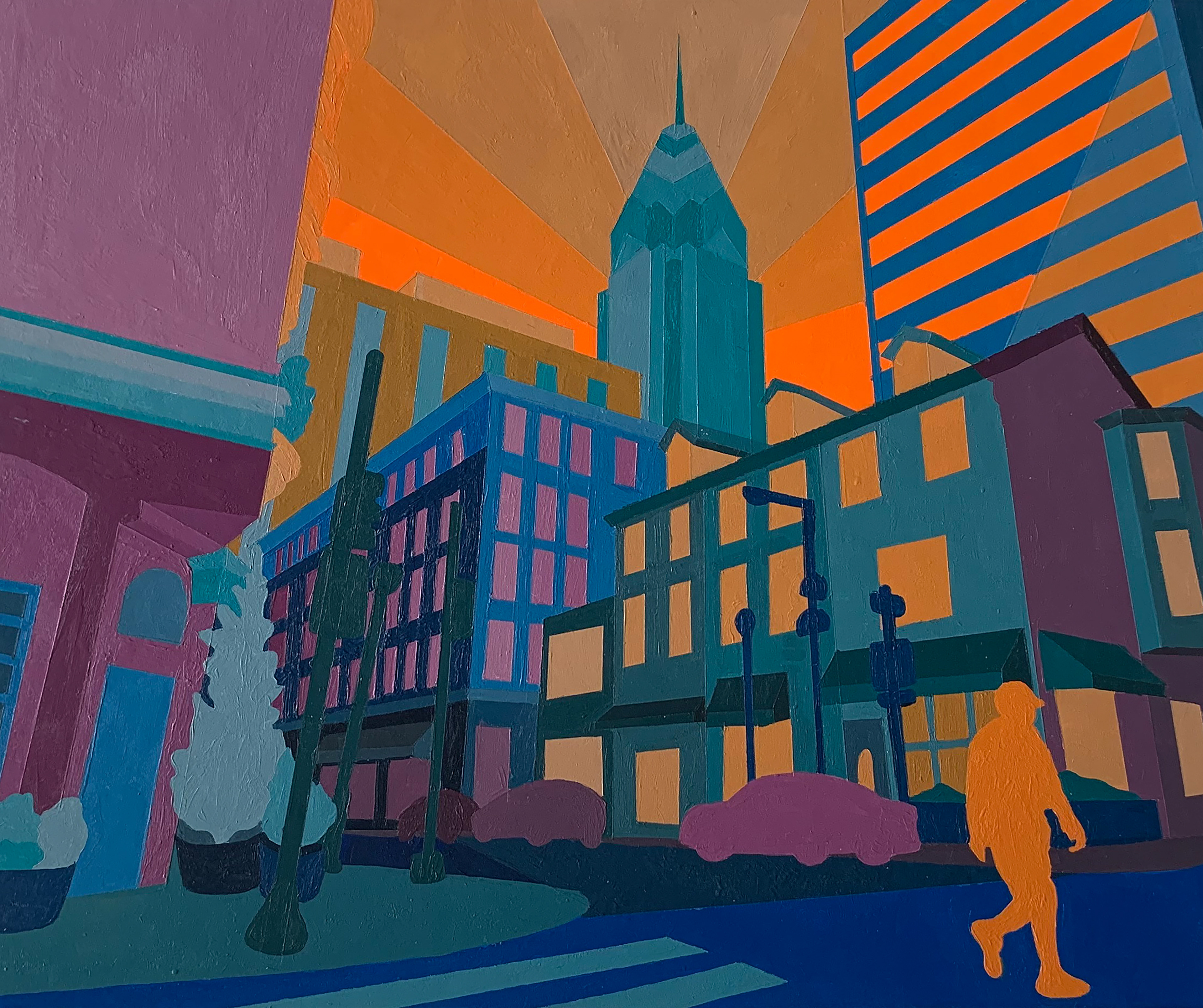 An urban scene painted using a triadic color combination with variations in shade. Acrylic paint on a 12x12 inch illustration board.