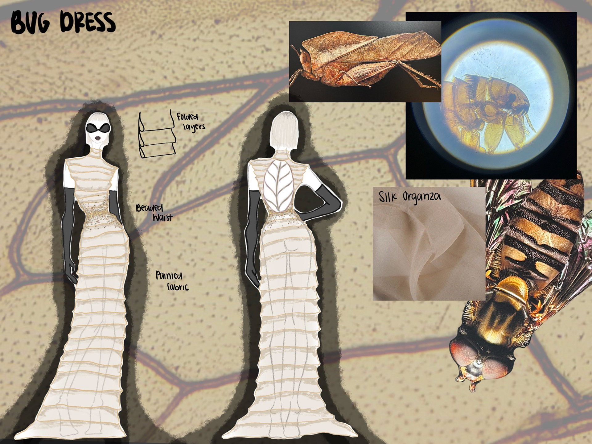 A gown inspired by the exoskeleton of a bug with a waist and back emphasis in silk organza. The bodice and skirt of the gown were constructed first and then strips of organza were folded in half and sewn on using French seams. Bodice lining was then attached. The dress was hand-painted to convey a bug-like texture. The waistline is emphasized using beading. Thumbnail sketches accompany the original design to create a mini collection.
