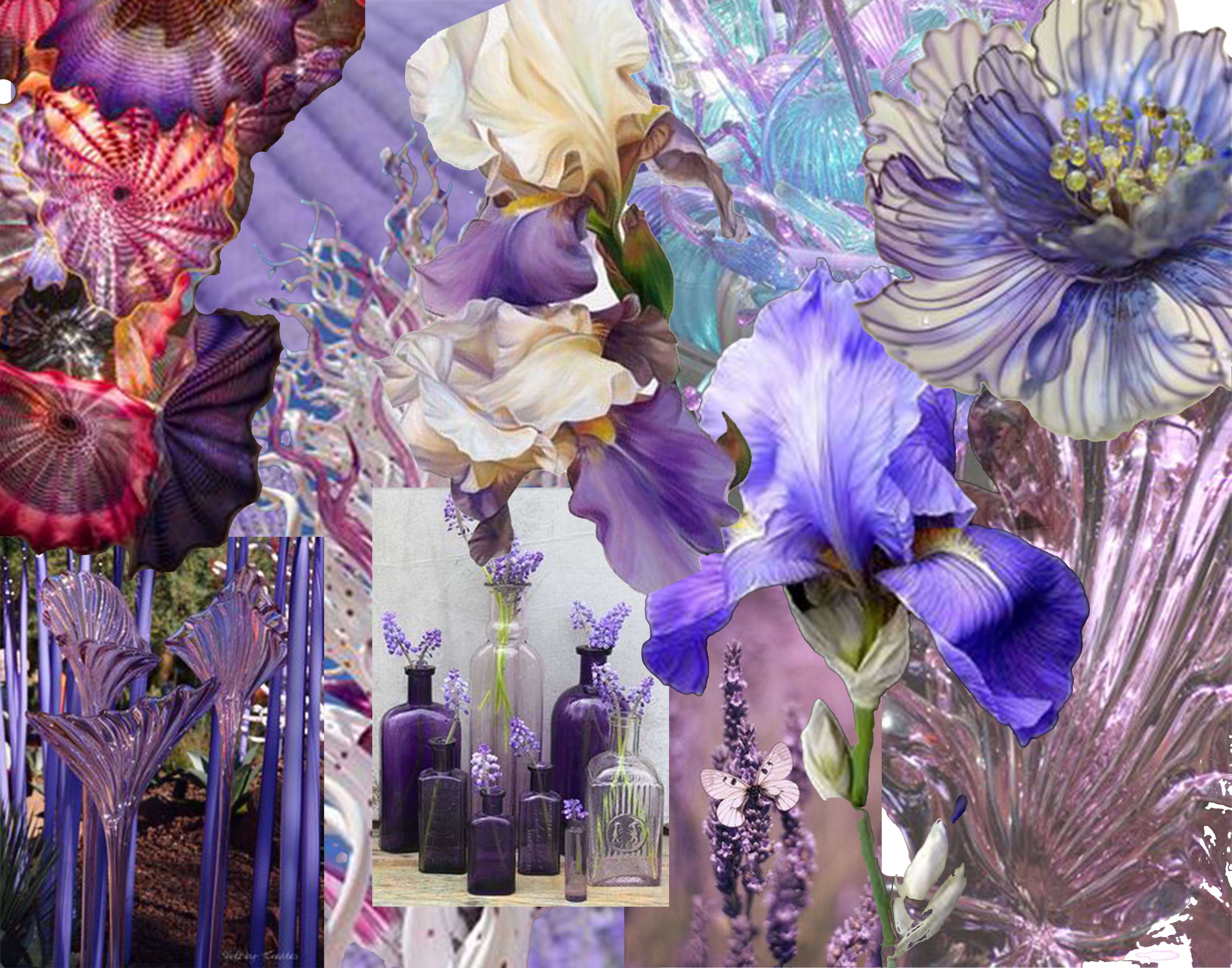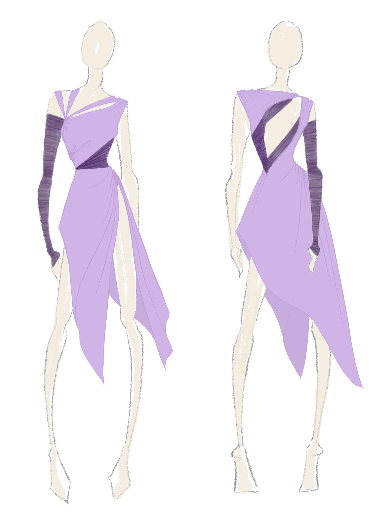 The dress is made from 100% rayon jersey and 100% silk chiffon. Inspired by the Chihuly Garden of blown glass in Seattle. The cutouts, intricate shapes, and ruching are meant to resemble the same shapes and textures created by the blown glass sculptures in the garden. Thumbnail sketches accompany the original design to create a mini collection.