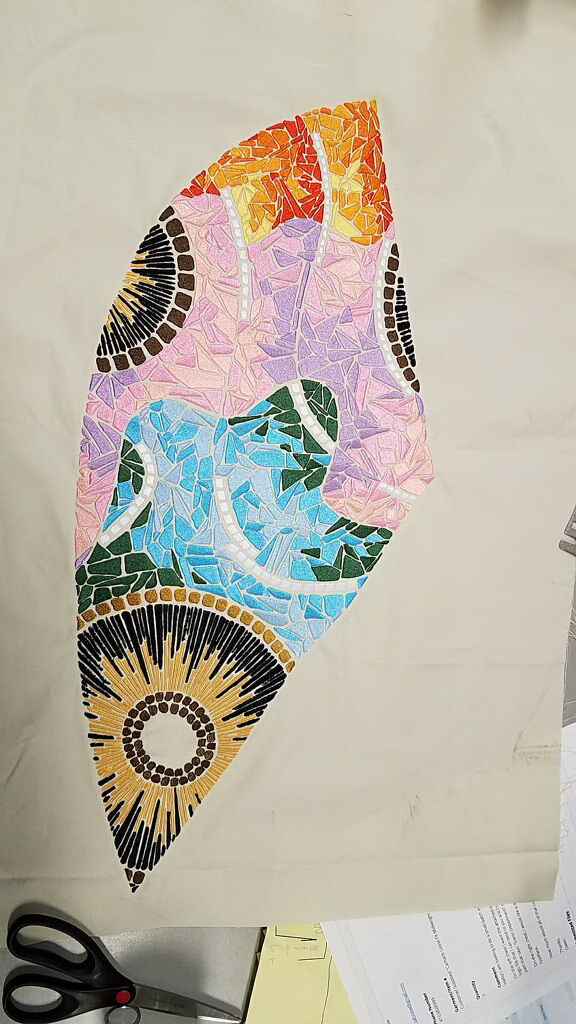Taking my mosaic design, I photoshopped it into the pattern pieces to scale and made sure they aligned. I then imported these pattern pieces into the Hatch embroidery software to digitize the final pieces. Hatch was a new software to me, so I acquired a new skill through this process.