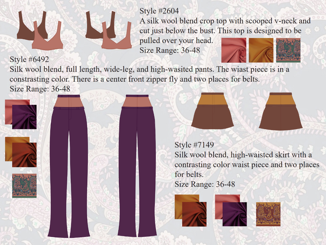 Woven swatches, print designs, woven garment illustrations, and tech flats.